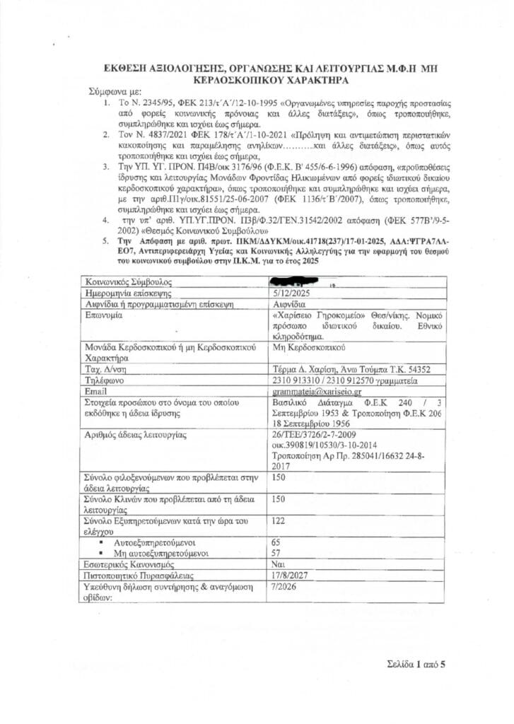 Άριστη Έκθεση Ελέγχου έλαβε το Χαρίσειο, έπειτα από αιφνιδιαστικό επιτόπιο έλεγχο και αυτοψία που πραγματοποιήθηκε την Παρασκευή 5 Δεκεμβρίου 2025 στις εγκαταστάσεις του Ιδρύματος, από τη Διεύθυνση Δημόσιας Υγείας & Κοινωνικής Μέριμνας της Περιφέρειας Κεντρικής Μακεδονίας.