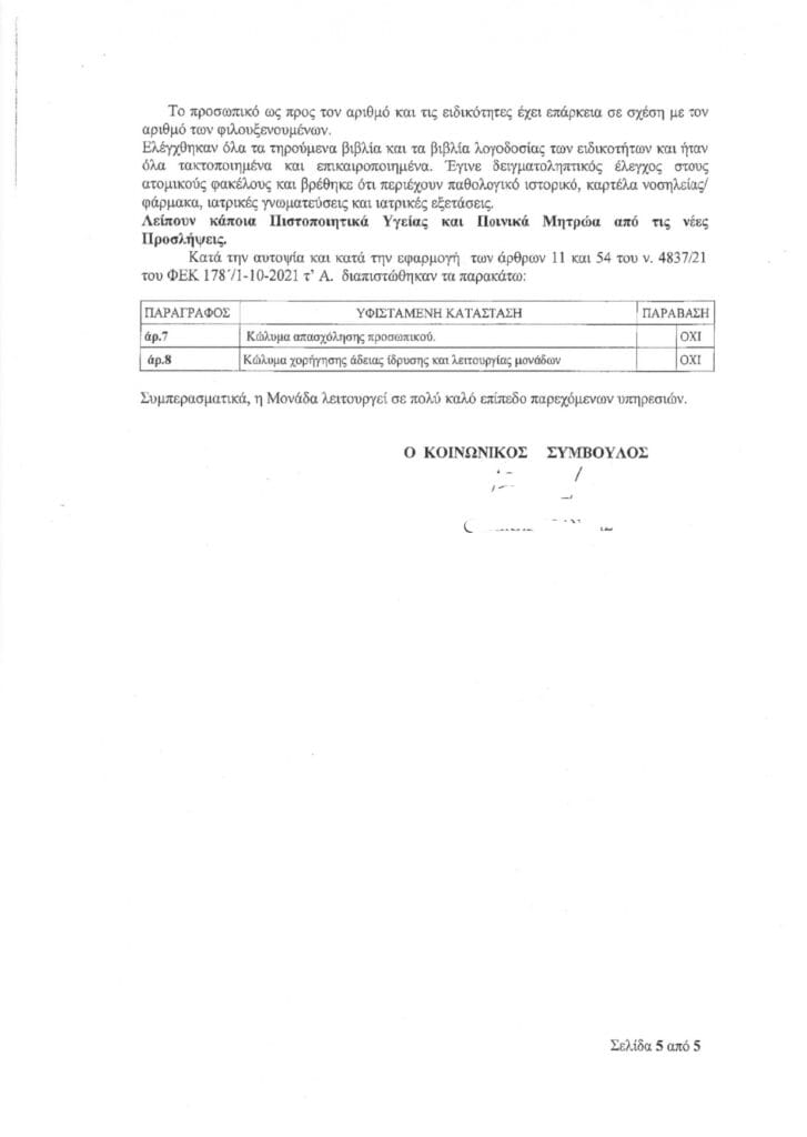 Σύμφωνα τόσο με την προφορική αποτίμηση κατά τη διάρκεια του ελέγχου όσο και με την έκθεση επιθεώρησης που διαβιβάστηκε, επιβεβαιώθηκε η άρτια λειτουργία της Μονάδας σε όλους τους τομείς.