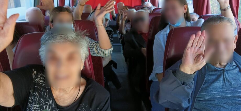 Ανέβηκαν στο λεωφορείο που με πολύ προθυμία μας διέθεσε ο Δήμος Θεσσαλονίκης και με τη συνοδεία προσωπικού του Χαρισείου Γηροκομείου ξεκίνησαν για μια περιήγηση στην πόλη γεμάτη αναμνήσεις.